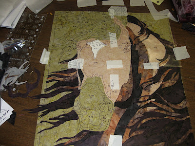 I had some projector sheets, taped 4 together and traced the horse template to position the top pieces. I taped down the background fabric (I'll do the borders after the horse is done) and taped the top of the sheets over it.