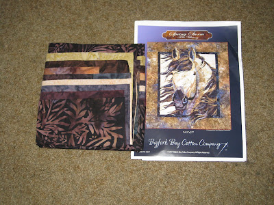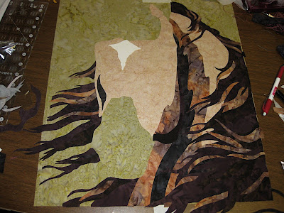 I got brave today and pulled out my "Spring Storm" horse applique kit. I've been dying to do it, I just wasn't sure how to do all the pieces. Plus I worried about running out of fabric and tracing all the pieces. The fusible webbing I have is really thin and comes apart from the paper just by moving it. It's all my LQS has as the ladies love it. I like the heavier stuff but that requires a trip to Lincoln or Omaha.